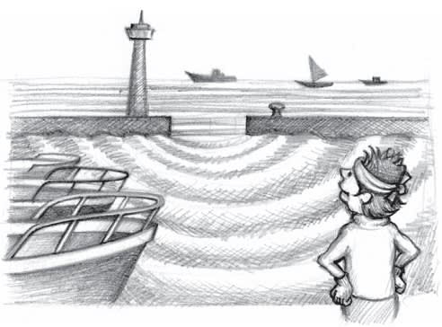入り口から入った波が湾全体に広がっていく (図「波には回折という性質がある」)。